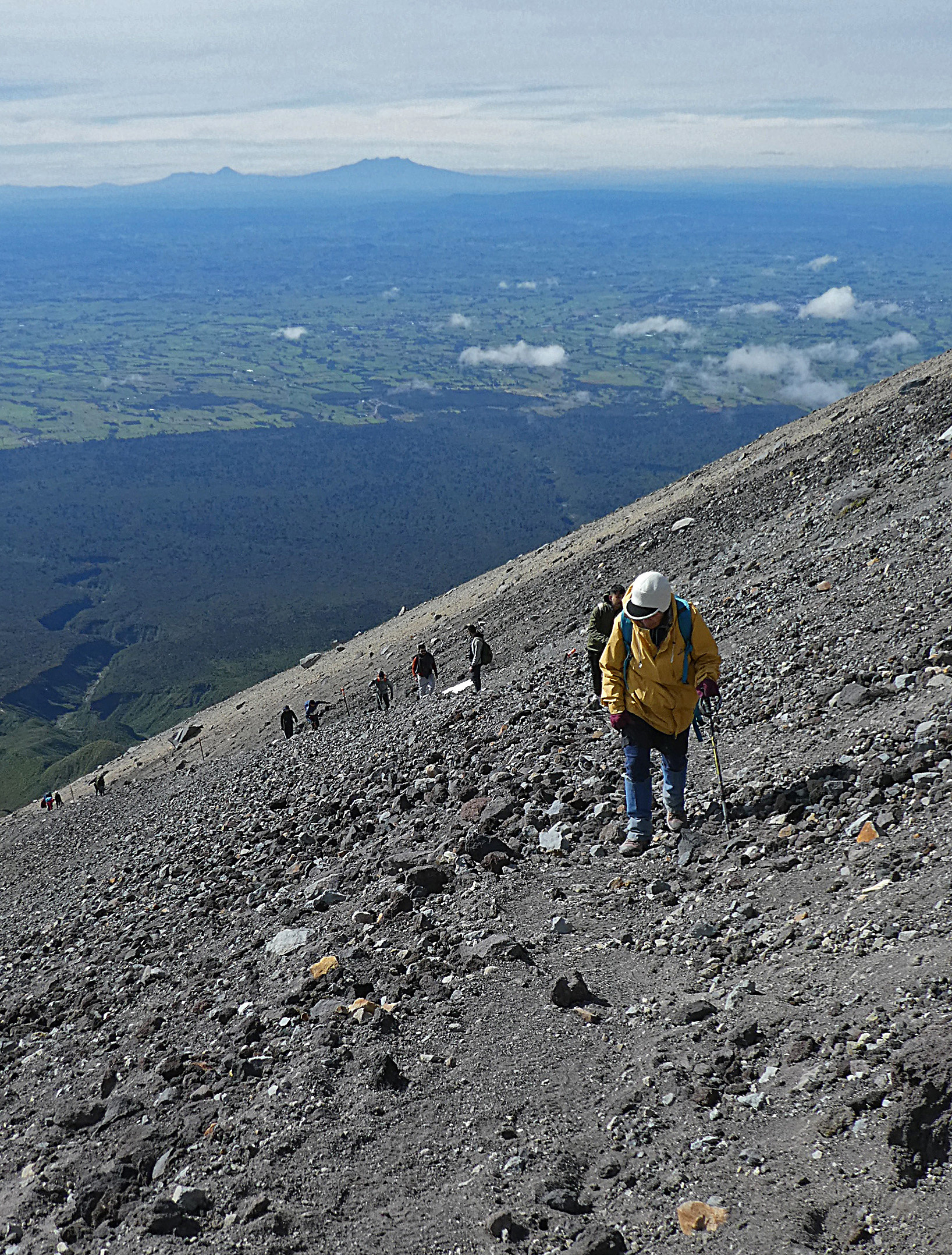 Saturday 8th – The forecast was good so we made an early start at the Stratford Mountain House road end. It was chilly at first but warmed up as we went past the ski field and around the track to the TV tower above North Egmont. From here we followed the main route up the north side, first on boardwalk and then onto hard scree. A few of us stopped at the crater while most of us did the scramble to the summit. After photos we headed back down.