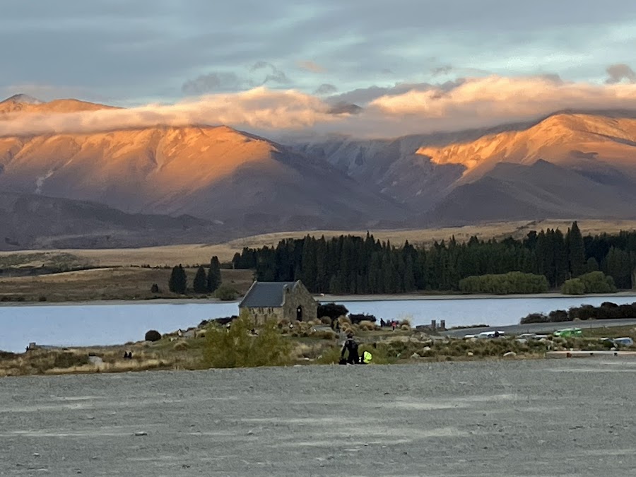 Nine of us met up at Christchurch airport on Monday morning for this luxury 7-day trip, with accommodation, some evening meals, and suitcase transfer between stops included. First, we got taken by minibus to Tekapo along with other clients of Cycle Journeys. Once at Tekapo we were allocated our bikes, regular for Rob and myself, electric for the others. We enjoyed a stunning vista from a lakeside restaurant where we had some pre-dinner refreshments.