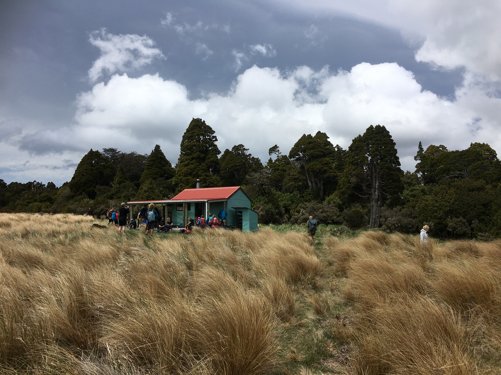 Ruahine Corner Hut, with its impressive kaikawaka backdrop
